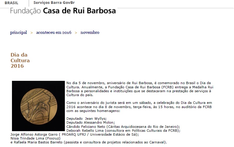 Medalha Rui Barbosa, uma condecoração para pessoas que contribuíram para o enriquecimento da cultura do país e com a instituição Fundação Casa de Rui Barbosa - FCRB.